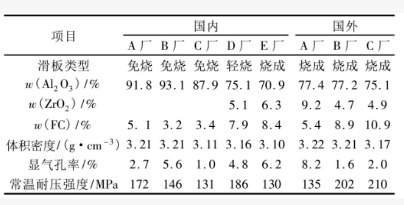 目前,國內(nèi)外滑板材質(zhì)仍然以鋁碳質(zhì)、鋁鋯碳質(zhì)為主。另外,對于特殊鋼的澆注,還使用鎂碳質(zhì)、鎂尖晶石質(zhì)、尖晶石碳質(zhì)和鋯質(zhì)滑板。