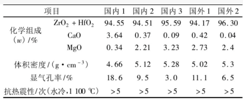 國內(nèi)外部分廠家定徑水口氧化鋯內(nèi)芯的理化性能指標(biāo)見表2。