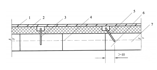 1-爐殼鋼板;2-隔熱層;3-拉磚鉤(或錨固鉤);4-托板磚;5—水平轉(zhuǎn)動(dòng)的拉磚鉤(或錨固鉤);6—磚縫或膨脹縫;7-隔熱耐火磚