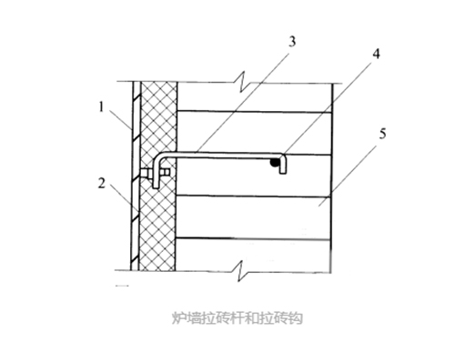 1-爐殼鋼板;2-隔熱層;3-拉磚鉤;4-拉磚桿;5-耐火磚