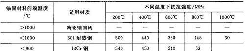 ② 在使用溫度下,錨固件應(yīng)該有良好的耐氧化性能。表1顯示了各種錨固材料的強(qiáng)度和溫度的關(guān)系。