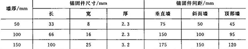 ⑤一般情況下,金屬錨固件的間距為施工厚度的1.5?3倍。垂直墻取值高些;頂部墻取值低些。表2顯示了Y形條形截面金屬錨固件的配置實(shí)例。