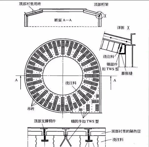 圖2中,吊掛的鋼結(jié)構(gòu)上焊有錨釘,錨釘拉住吊頂磚,吊頂磚托住澆注料,吊頂磚的空隙中又加有金屬錨固件。這樣,就保證了吊頂?shù)姆€(wěn)固性,巧妙完成了形狀、結(jié)構(gòu)都十分復(fù)雜的旋風(fēng)筒頂部的耐火材料砌筑。